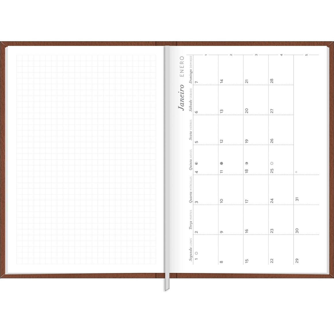 Este produto, com visão de um dia por página, exceto sábado e domingo, possui acabamento costurado e capa com espuma revestida em material especial. A parte interna conta com: